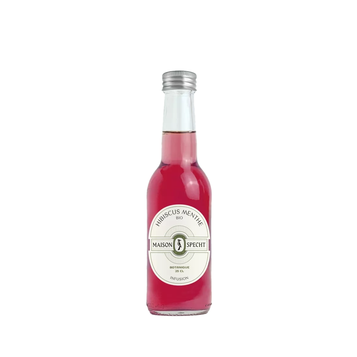 Ingrédients : Infusion de fleurs d’hibiscus bio (65 %), infusion de menthe bio (20 %), eau, sucre bio, acide citrique